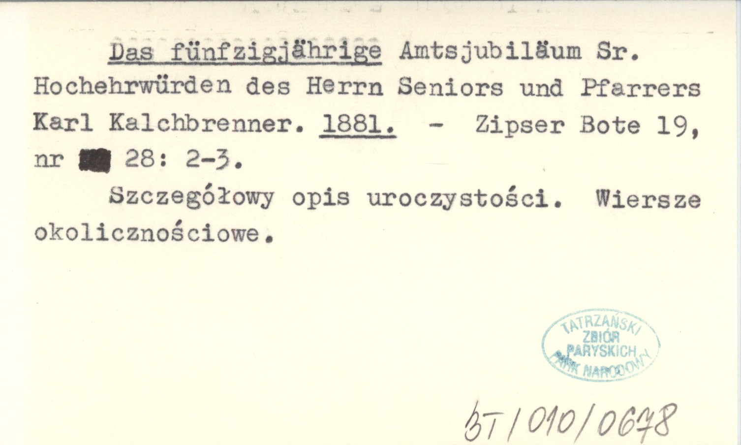 Das fünfzigjährige Amtsjubiläum Sr. Hochehrwürden des Herrn Seniors und Pfarrers Karl Kalchbrenner. 1881