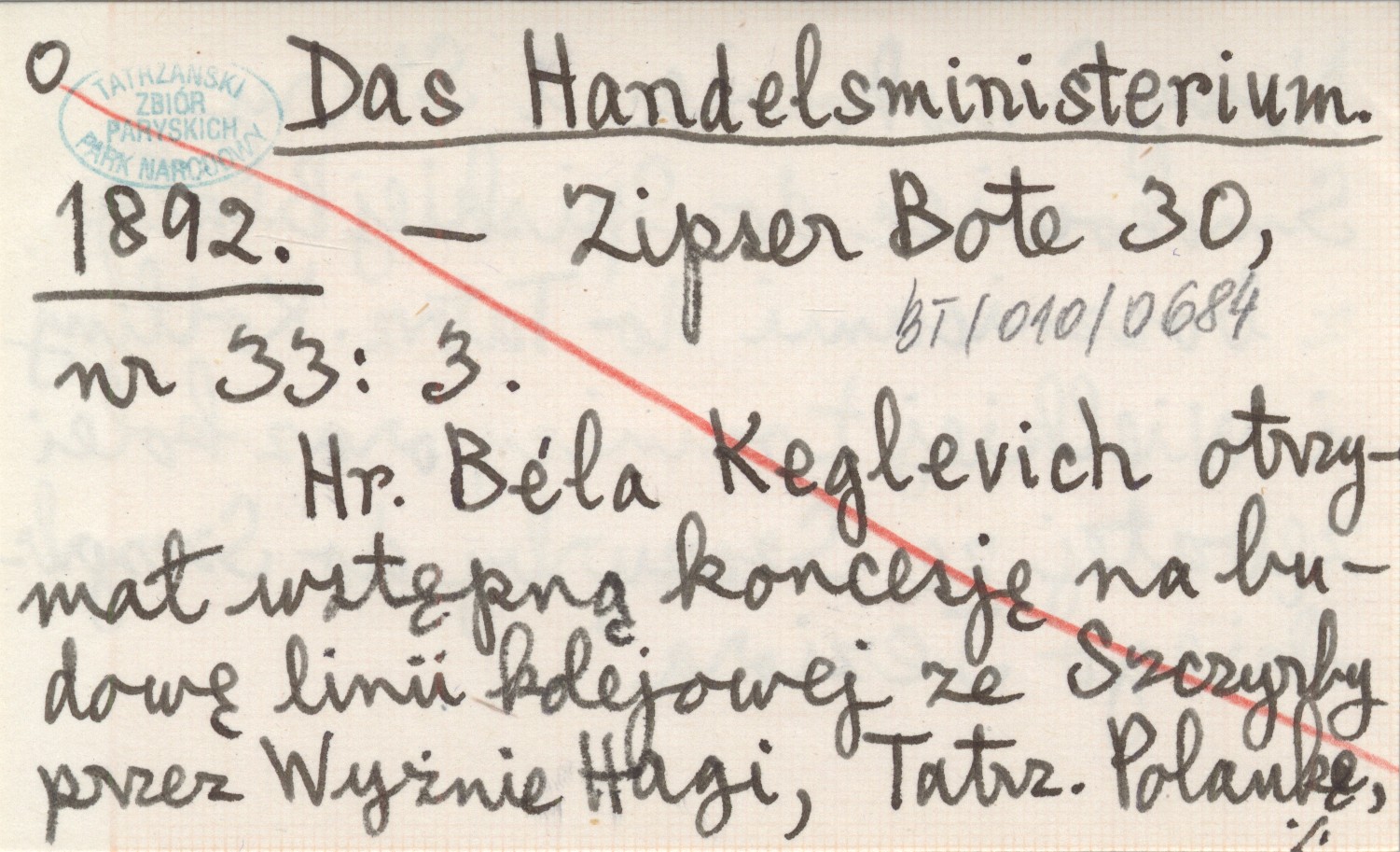 Zipser Bote, 30, nr 33: 3. Hr. Béla Keglevich otrzymał wstępną koncesję na budowę linii kolejowej ze Szczyrby przez Wyżnie Hagi, Tatrzańską Polankę, Nowy Smokowiec i Stary Smokowiec do Spiskiej Białej z bocznicami do Tatrzańskiej Kotliny i Wielkiej Łomnicy oraz kolei zębatej ze Szczyrby do Szczyrbskiego Jeziora.