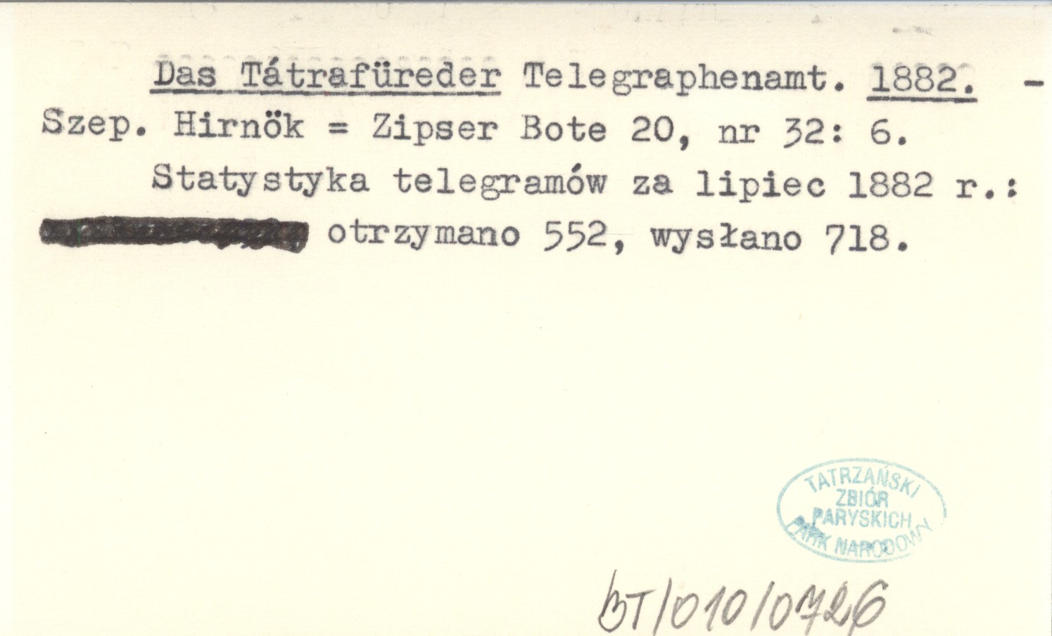 Szepesi Hirnök = Zipser Bote, 20, nr 32: 6. Statystyka telegramów za lipiec 1882 r.: otrzymano 552, wysłano 718.