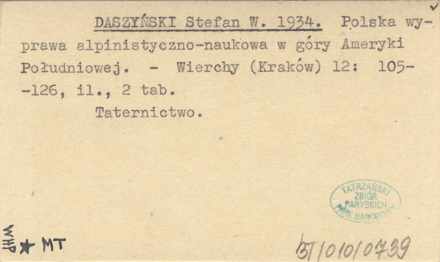 DASZYŃSKI Stefan W. 1934 Polska wyprawa alpinistyczno-naukowa w góry Ameryki Południowej.