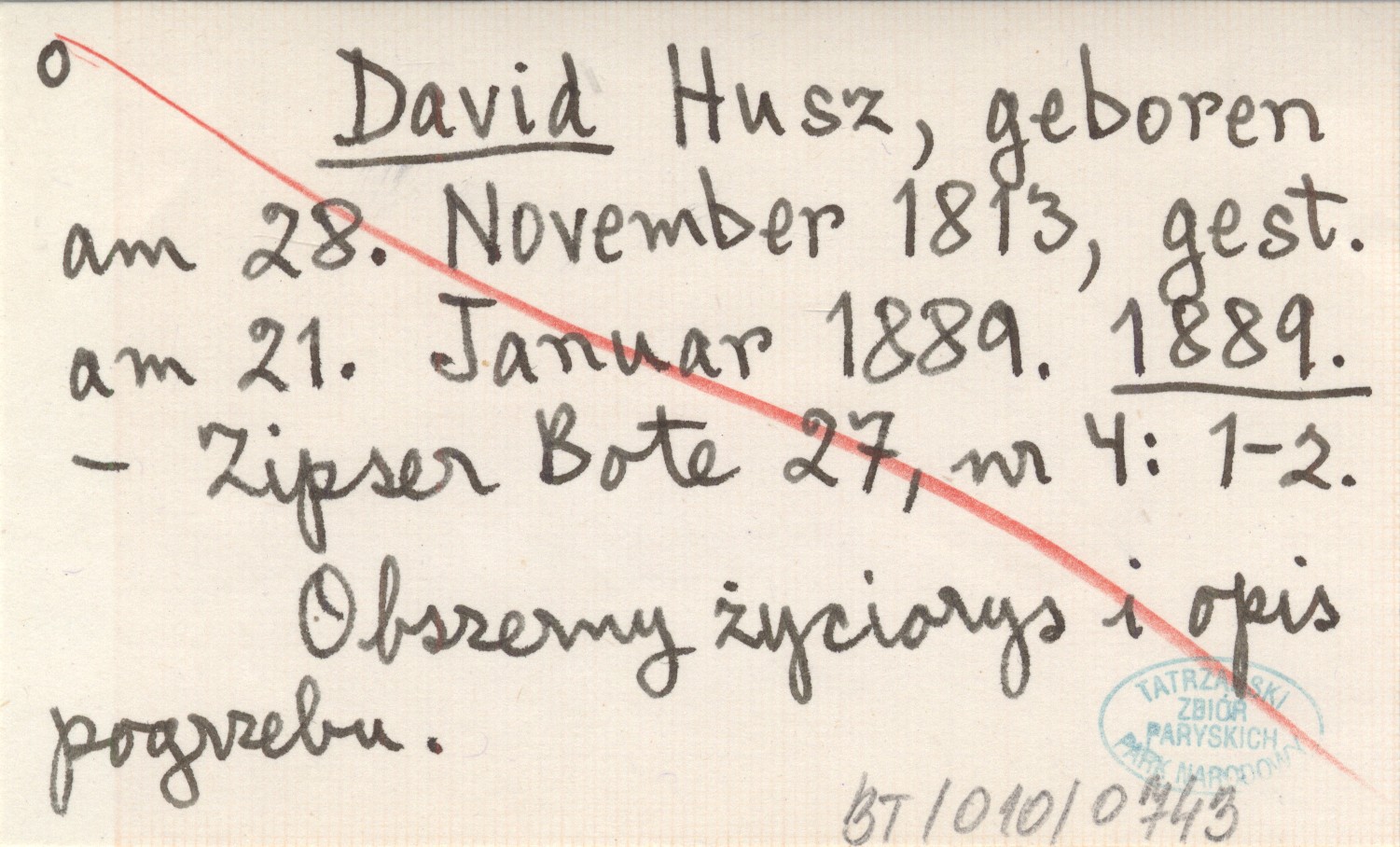 David Husz, geboren am 28. November 1813, gest. am 21. Januar 1889. 1889