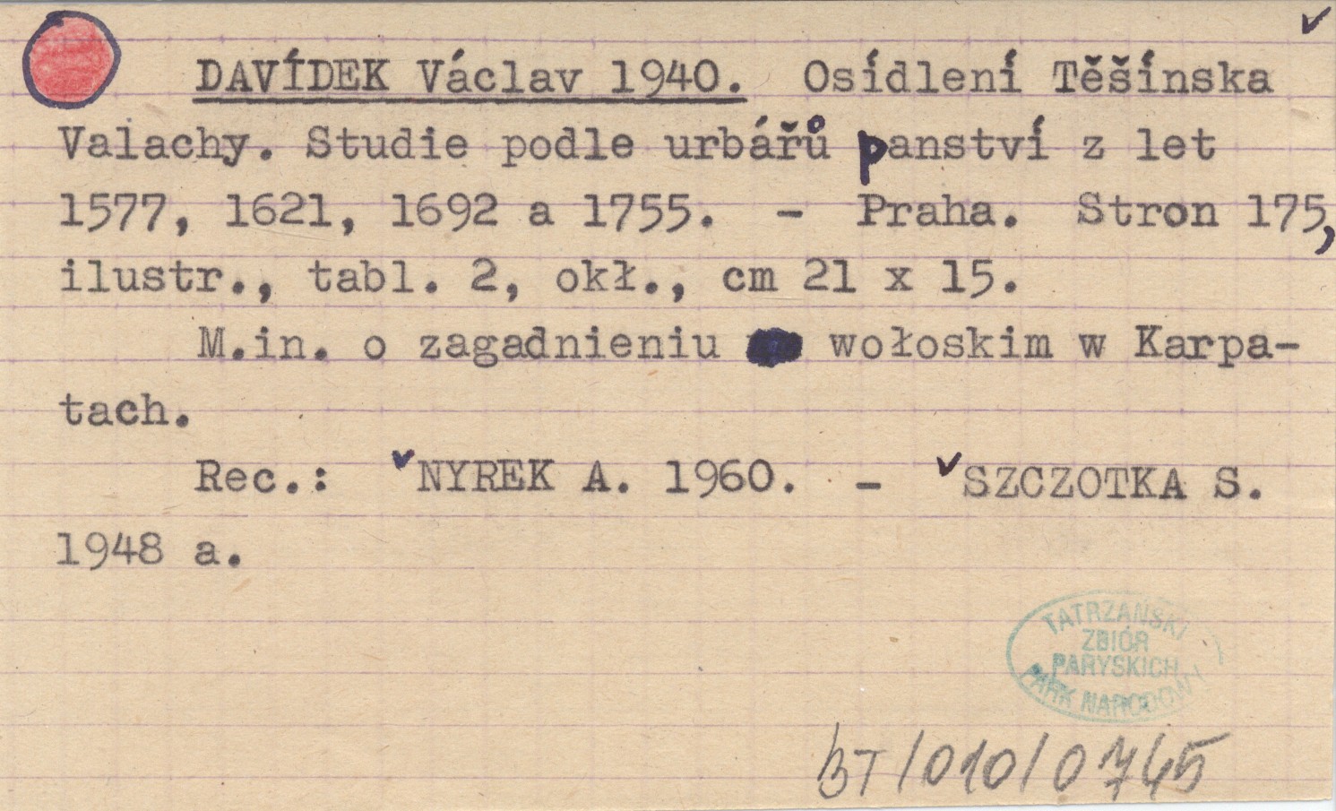 DÁVIDEK Václav 1940 Osídlení Těšínska Valachy. Studie podle urbářů panství z let 1577, 1621, 1692 a 1755.