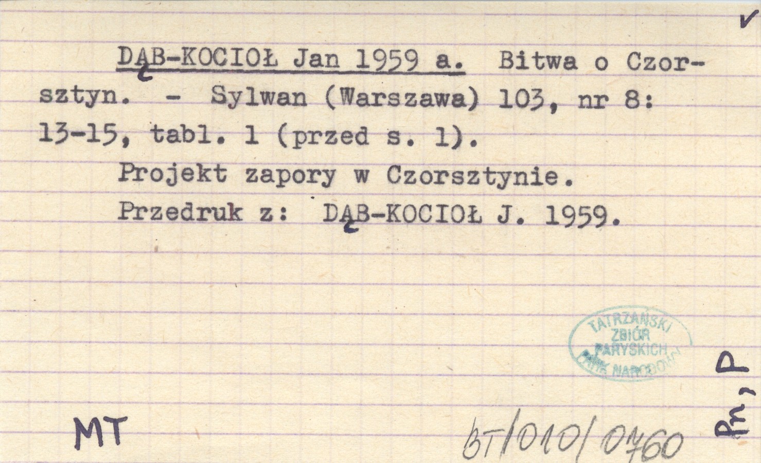 Sylwan (Warszawa) , 104, nr 8: 13-15, 1 k. (przed S. 1). Projekt zapory w Czorsztynie. Przedruk z: DĄB-KOCIOŁ J. 1959.