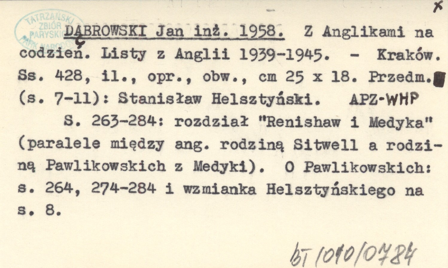 Kraków , 428 s., il., opr., obw., 25x18 cm. S. 263-284: rozdział "Renishaw i Medyka" (paralele między angielską rodziną Sitwell a rodziną Pawlikowskich z Medyki). O Pawlikowskich: S. 264, 274-284 i wzmianka Helsztyńskiego na S. 8. Przedmowa (S. 7-11): Stanisław Helsztyński.
