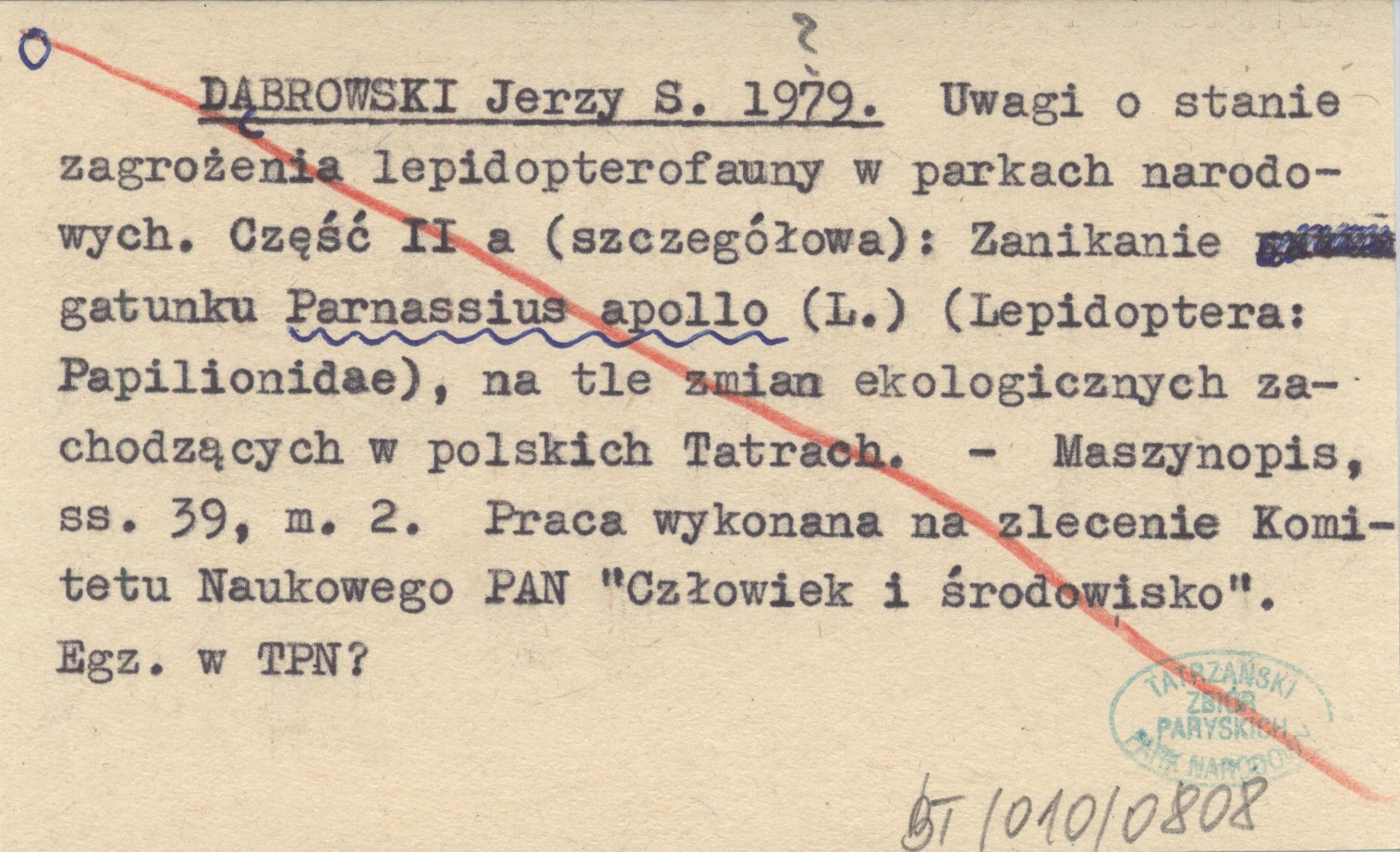 DĄBROWSKI Jerzy S. 1979? Uwagi o stanie zagrożenia lepidopterofauny w parkach narodowych. Część II a (szczegółowa): Zanikanie gatunku Parnassius apollo (L.) (Lepidoptera: Papilionidae), na tle zmian ekologicznych zachodzących w polskich Tatrach.