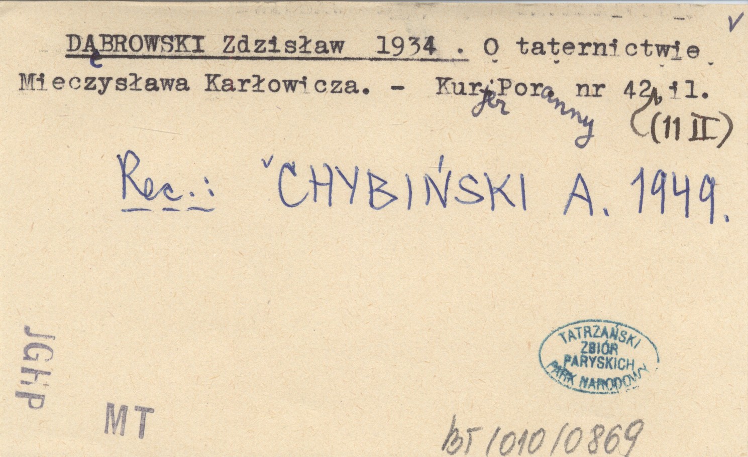 DĄBROWSKI Zdzisław 1934 O taternictwie Mieczysława Karłowicza.