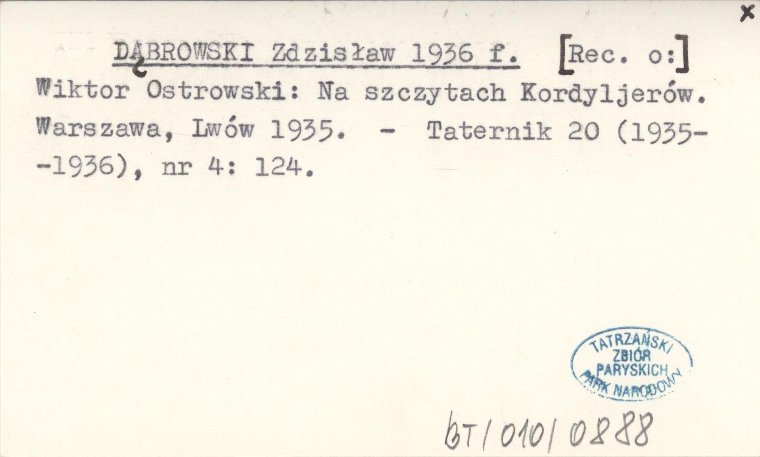 DĄBROWSKI Zdzisław 1936 f [Rec. o:] Wiktor Ostrowski: Na szczytach Kordyljerów. Warszawa, Lwów 1935.