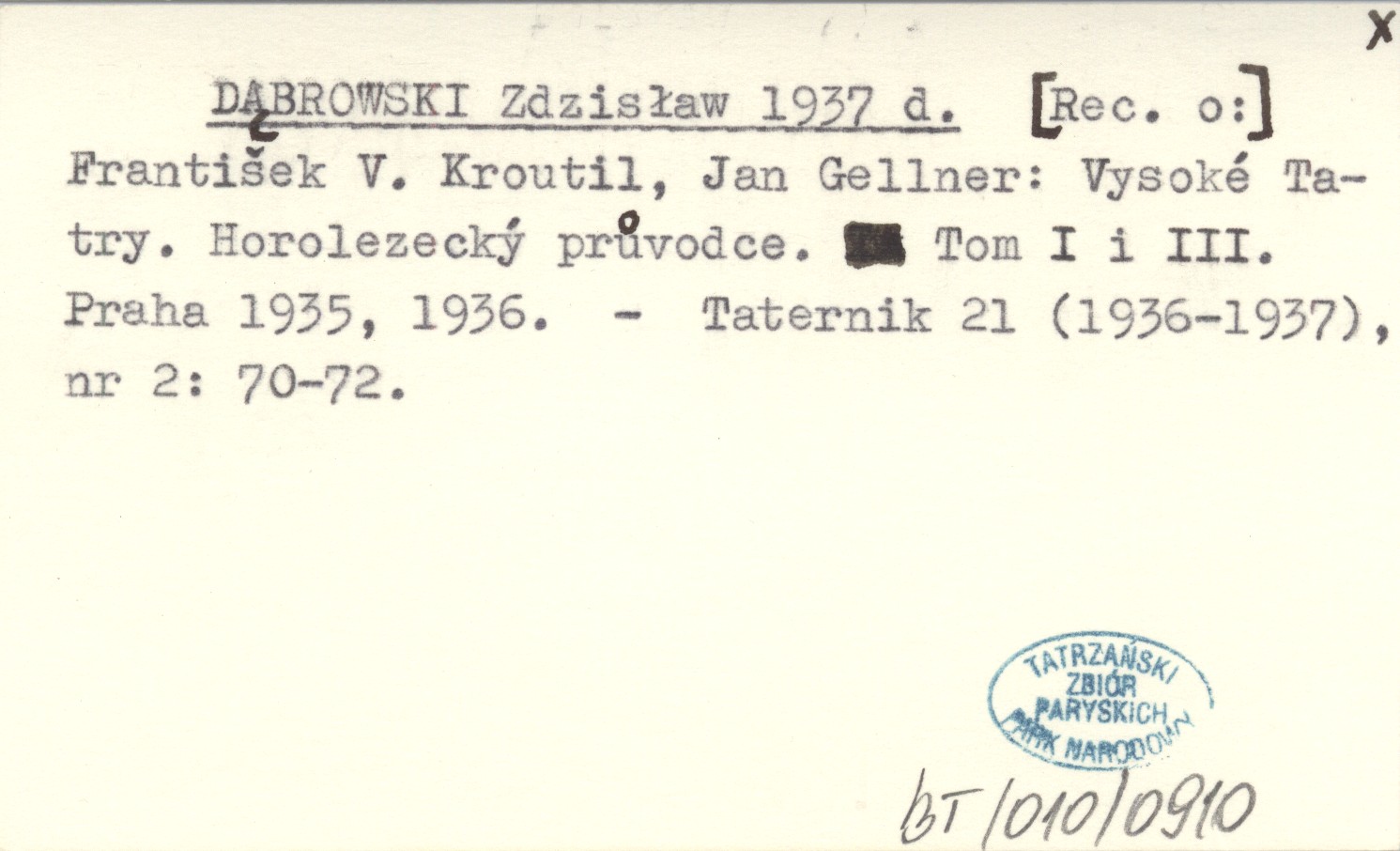 DĄBROWSKI Zdzisław 1937 d [Rec. o:] František V. Kroutil, Jan Gellner" Vysoké Tatry. Horolezecký průvodce. Tom I i III. Praha 1935, 1936.