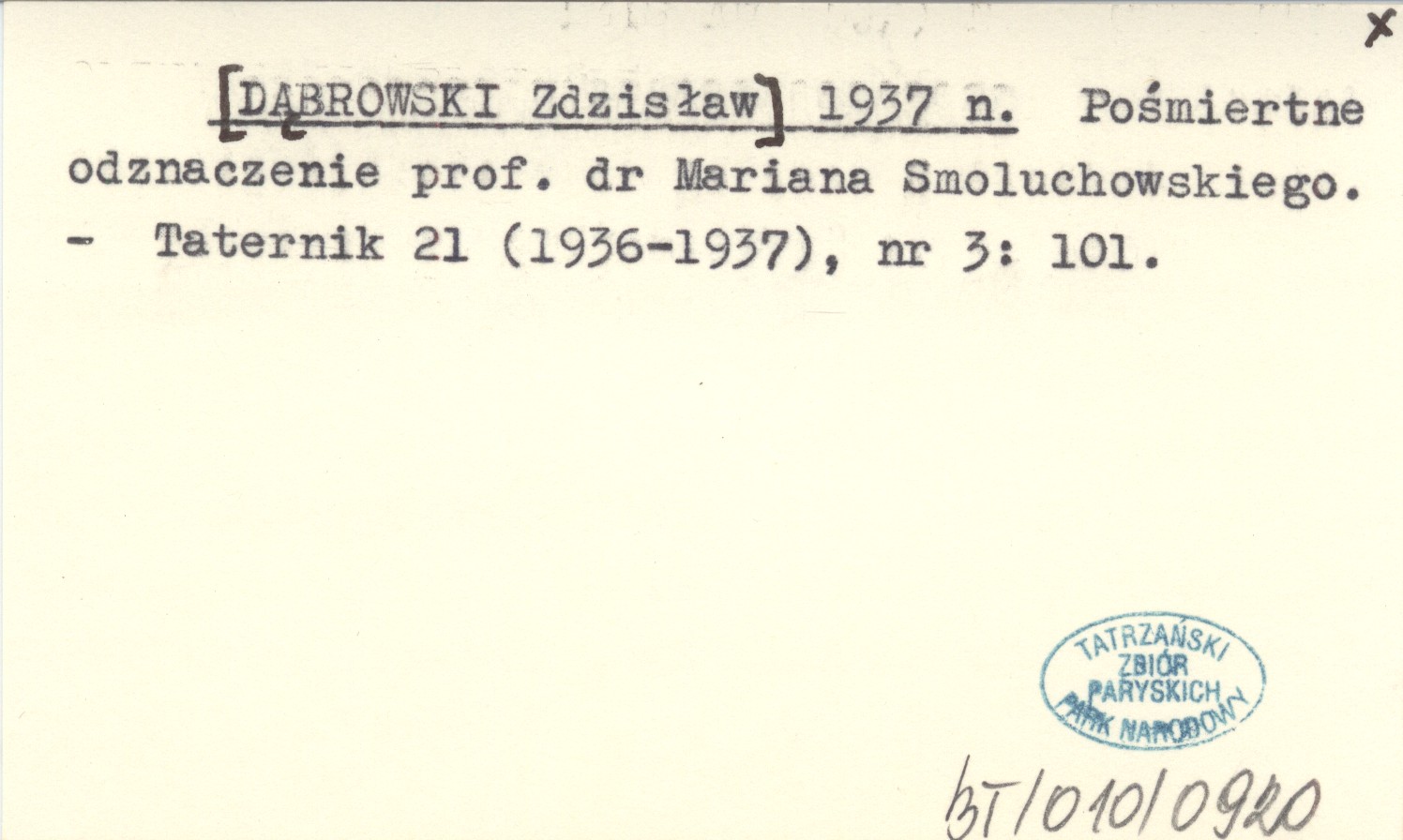 [DĄBROWSKI Zdzisław] 1937 n Pośmiertne odznaczenie prof. dr Mariana Smoluchowskiego.
