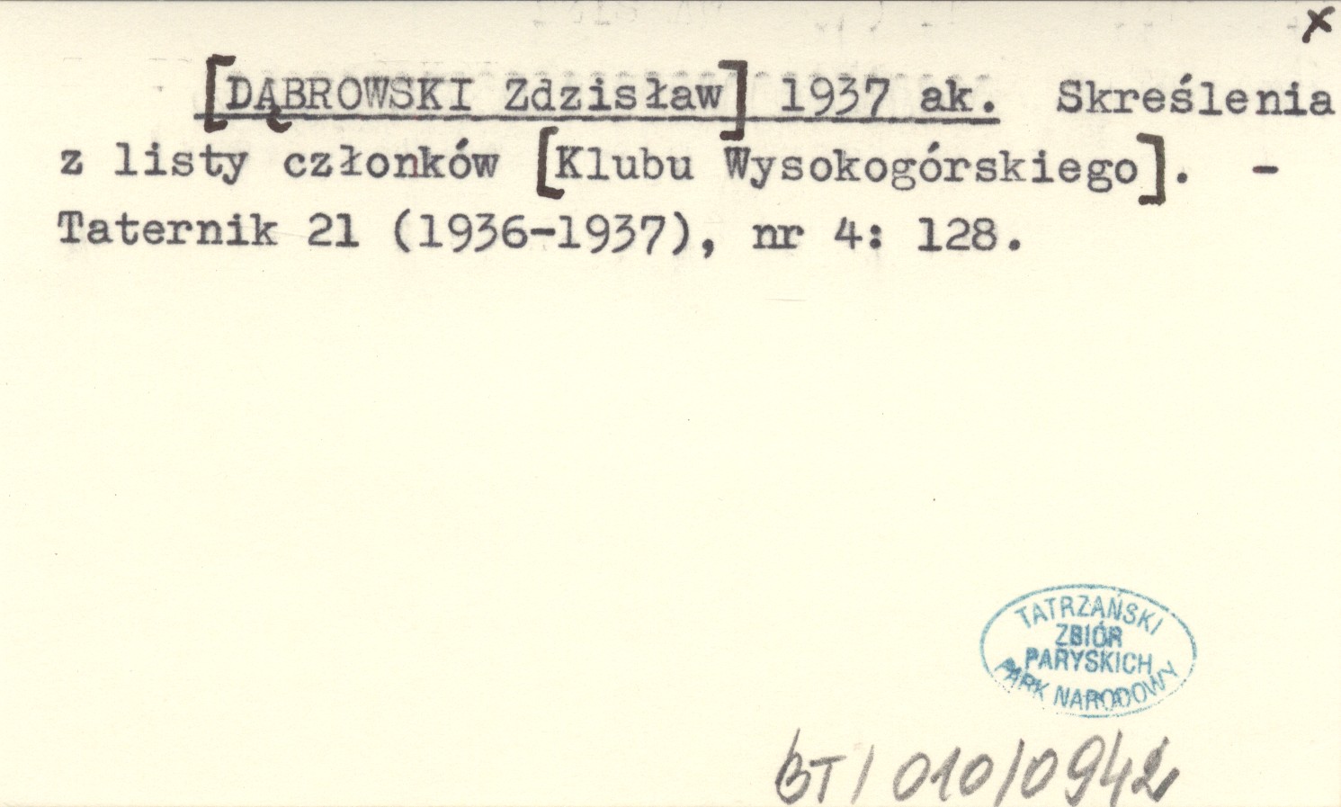[DĄBROWSKI Zdzisław] 1937 ak Skreślenia z listy członków [Klubu Wysokogórskiego].