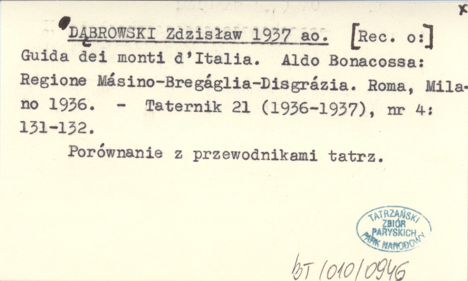DĄBROWSKI Zdzisław 1937 ao [Rec. o:] Guida dei monti d'Italia. Aldo Bonacossa: Regione Másino-Bregáglia-Disgrázia. Roma, Milano 1936.