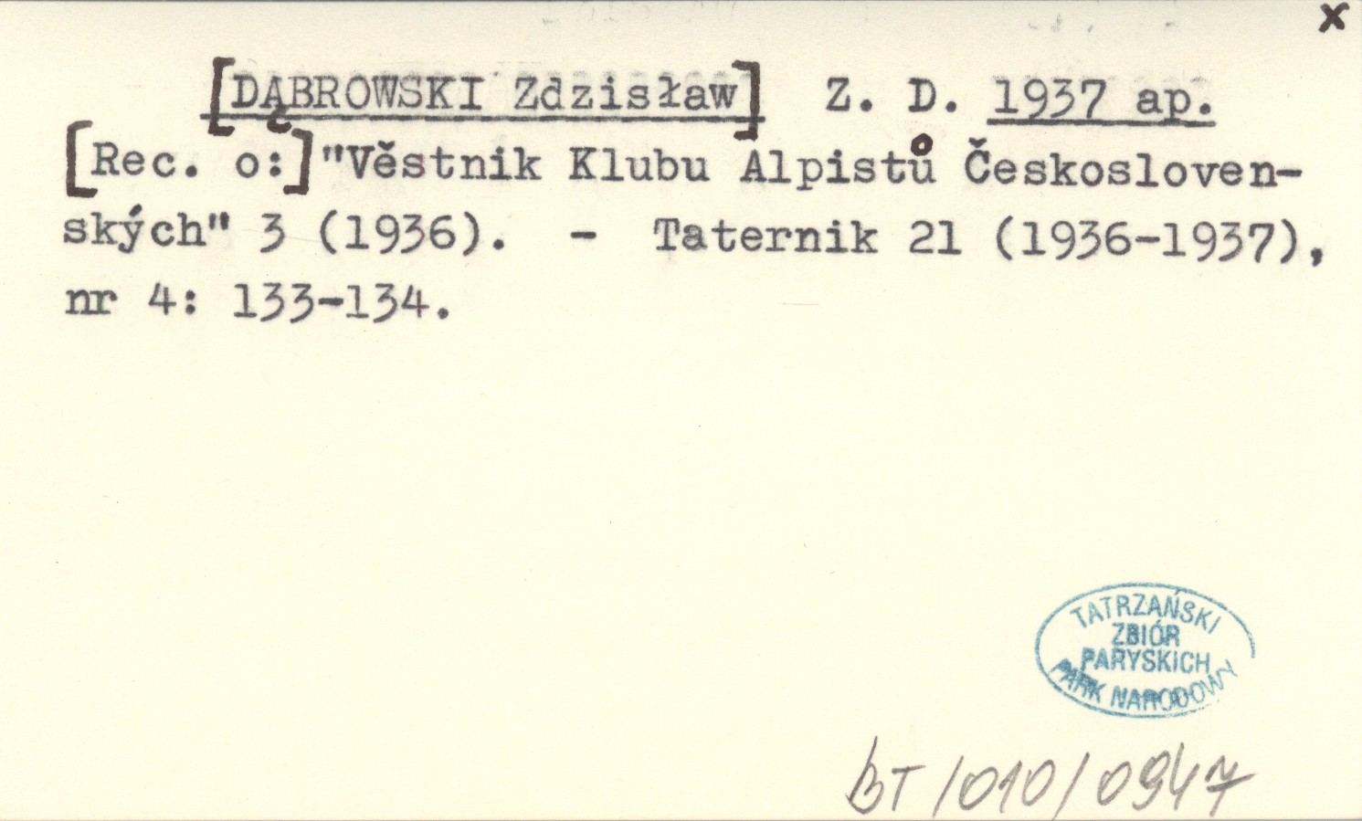 Z. D. [DĄBROWSKI Zdzisław] 1937 ap [Rec. o:] "Věstnik Klubu Alpistů Československých" 3 (1936).
