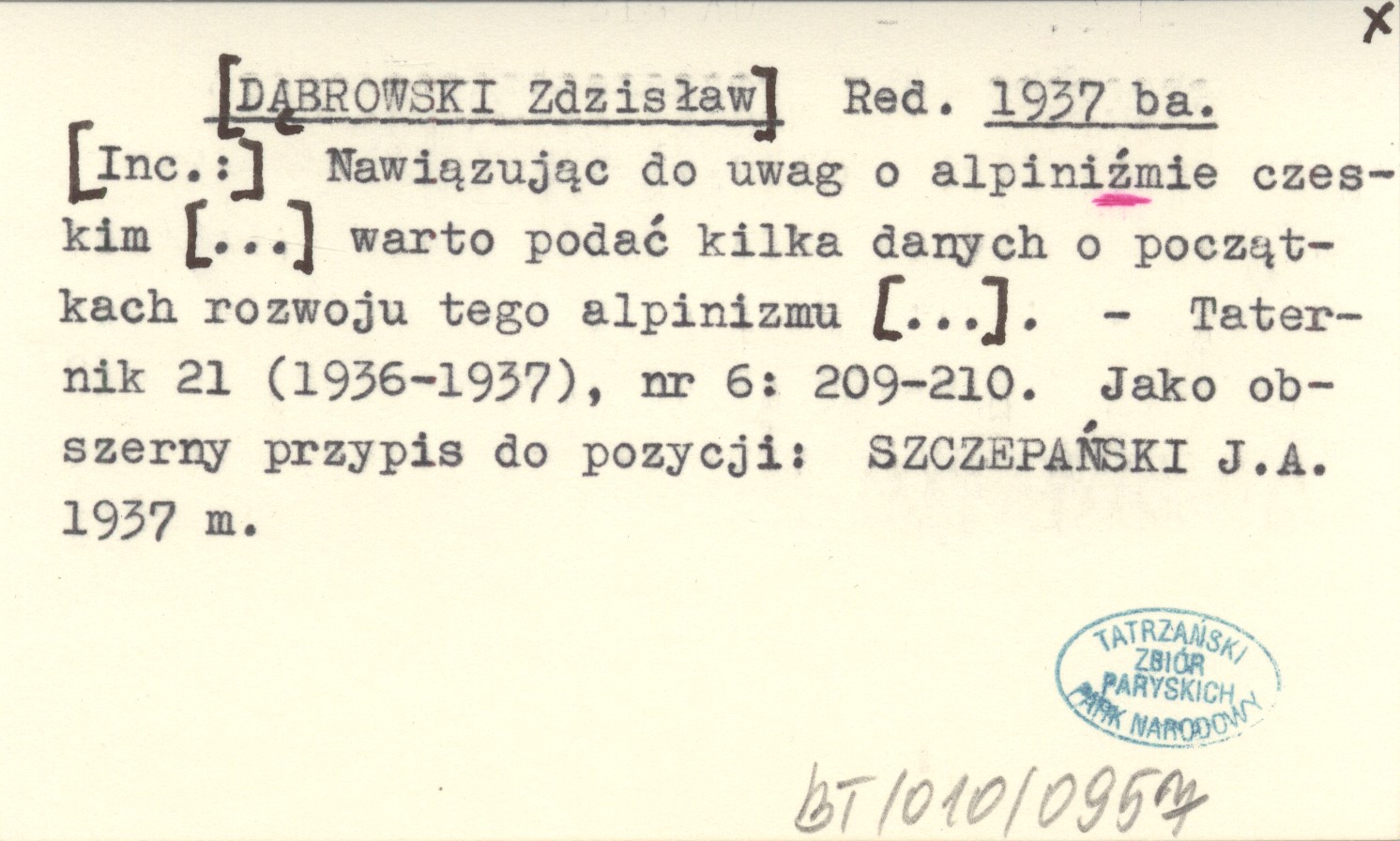 Red. [DĄBROWSKI Zdzisław] 1937 ba [Inc.:] Nawiązując do uwag o alpiniźmie czeskim [...] warto podać kilka danych o początkach rozwoju tego alpinizmu [...].