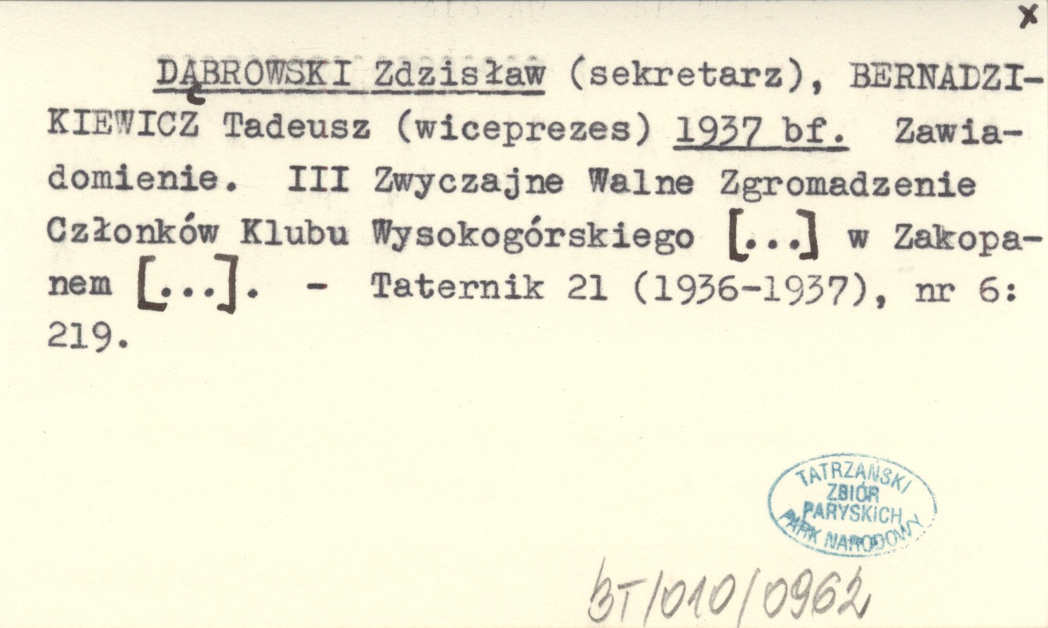 sekretarz DĄBROWSKI Zdzisław] BERNADZIKIEWICZ, Tadeusz (wiceprezes). ; 1937 bf Zawiadomienie. III Zwyczajne Walne Zgromadzenie Członków Klubu Wysokogórskiego [...] w Zakopanem [...].
