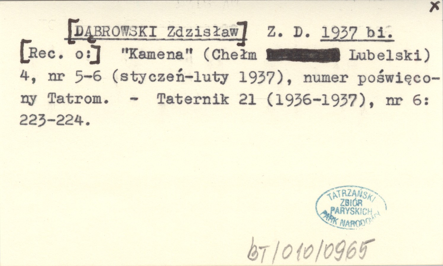 Z. D. [DĄBROWSKI Zdzisław] 1937 bi [Rec. o:] "Kamena" (Chełm Lubelski) 4, nr 5-6 (styczeń-luty 1937), numer poświęcony Tatrom.