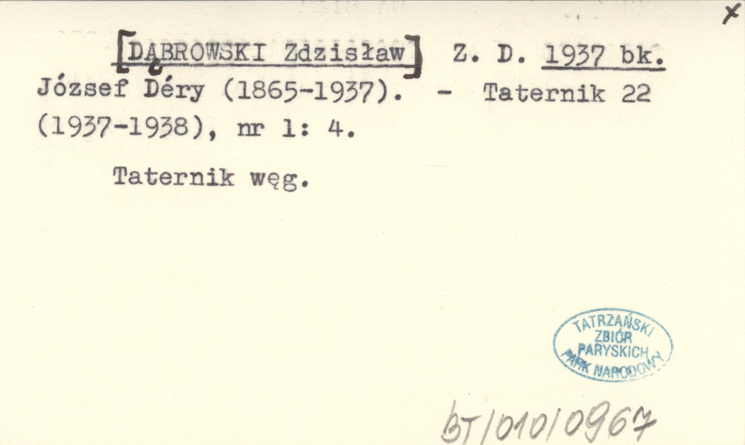 Z. D. [DĄBROWSKI Zdzisław] 1937 bk József Déry (1865-1937).
