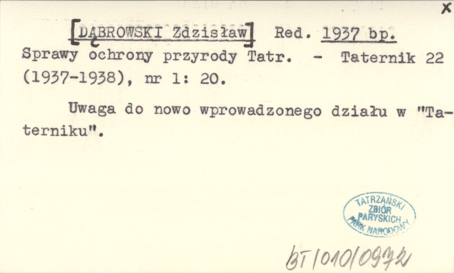 Red. [DĄBROWSKI Zdzisław] 1937 bp Sprawy ochrony przyrody Tatr.