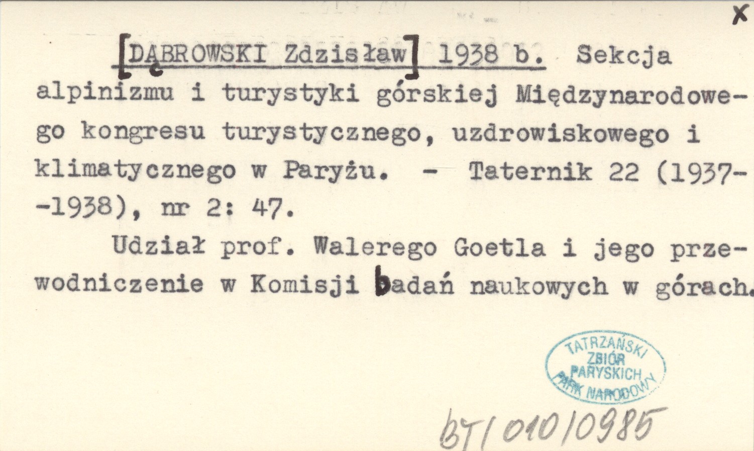 [DĄBROWSKI Zdzisław] 1938 b Sekcja alpinizmu i turystyki górskiej Międzynarodowego kongresu turystycznego, uzdrowiskowego i klimatycznego w Paryżu.