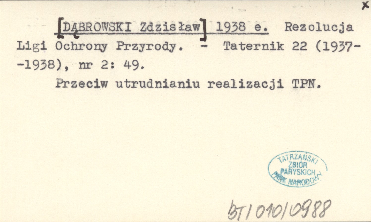 [DĄBROWSKI Zdzisław] 1938 e Rezolucja Ligi Ochrony Przyrody.