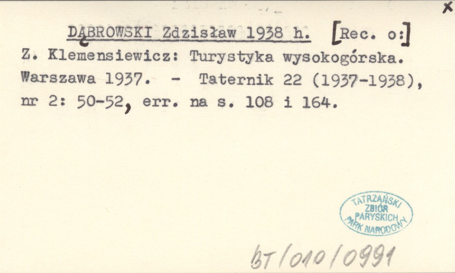 DĄBROWSKI Zdzisław 1938 h [Rec. o:] Z. Klemensiewicz: Turystyka wysokogórska. Warszawa 1937.