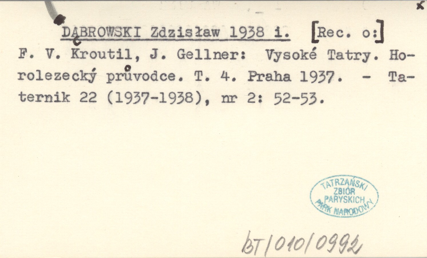 DĄBROWSKI Zdzisław 1938 i [Rec. o:] F. V. Kroutil, J. Gellner: Vysoké Tatry. Horolezecký průvodce. T. 4. Praha 1937.