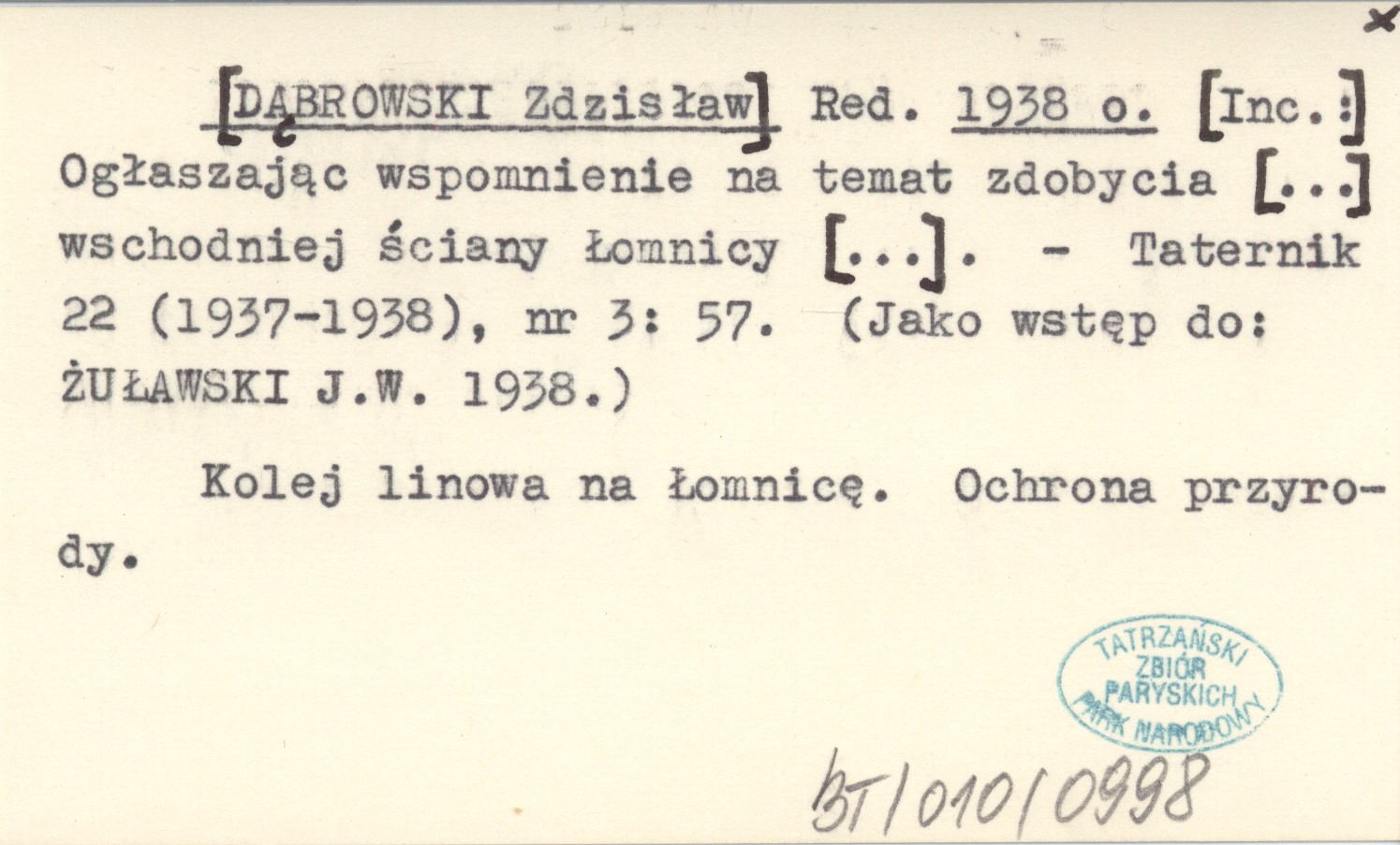 Red. [DĄBROWSKI Zdzisław] 1938 o [Inc.:] Ogłaszając wspomnienie na temat zdobycia [...] wschodniej ściany Łomnicy [...].