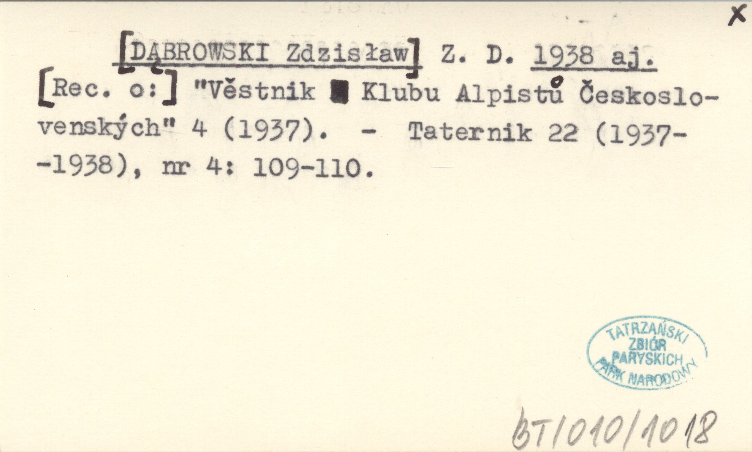 Z. D. [DĄBROWSKI Zdzisław] 1938 aj [Rec. o:] "Véstnik Klubi Alpistů Československých" 4 (1937).