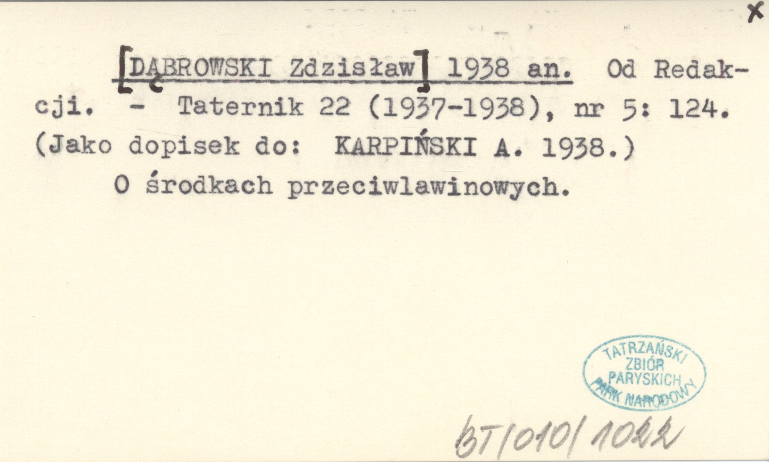 Taternik, 22 (1937-1938), nr 5: 124. O środkach przeciwlawinowych. Jako dopisek do: KARPIŃSKI A. 1938.