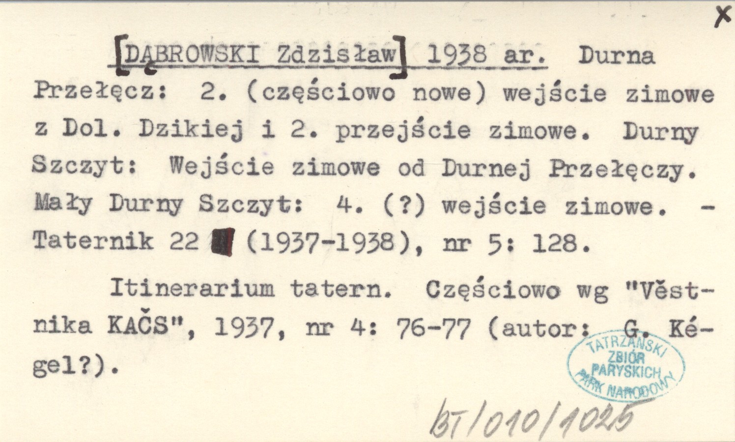 [DĄBROWSKI Zdzisław] 1938 ar Durna Przełęcz: 2. (częściowo nowe) wejście zimowe z Dol. Dzikiej i 2. przejście zimowe. Durny Szczyt: Wejście zimowe od Durnej Przełęczy. Mały Durny Szczyt: 4. (?) wejście zimowe.