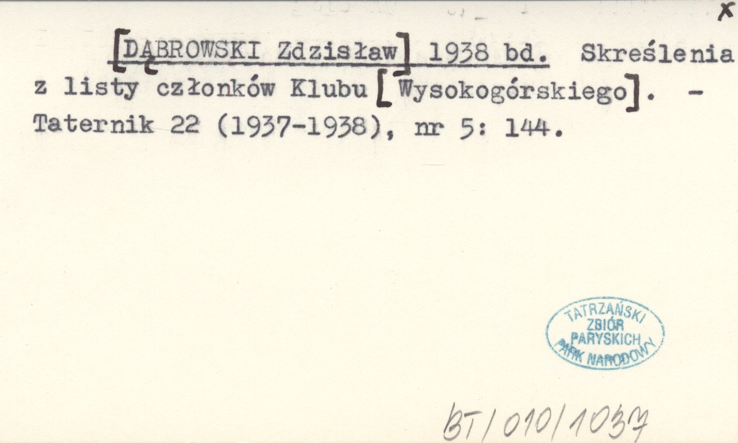 [DĄBROWSKI Zdzisław] 1938 bd Skreślenia z listy członków Klubu [Wysokogórskiego].
