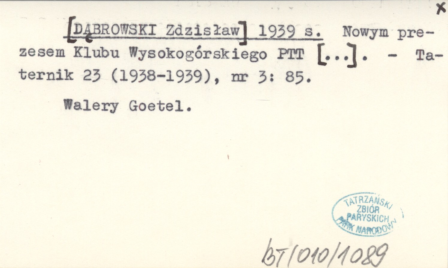 [DĄBROWSKI Zdzisław] 1939 s Nowym prezesem Klubu Wysokogórskiego PTT [...].