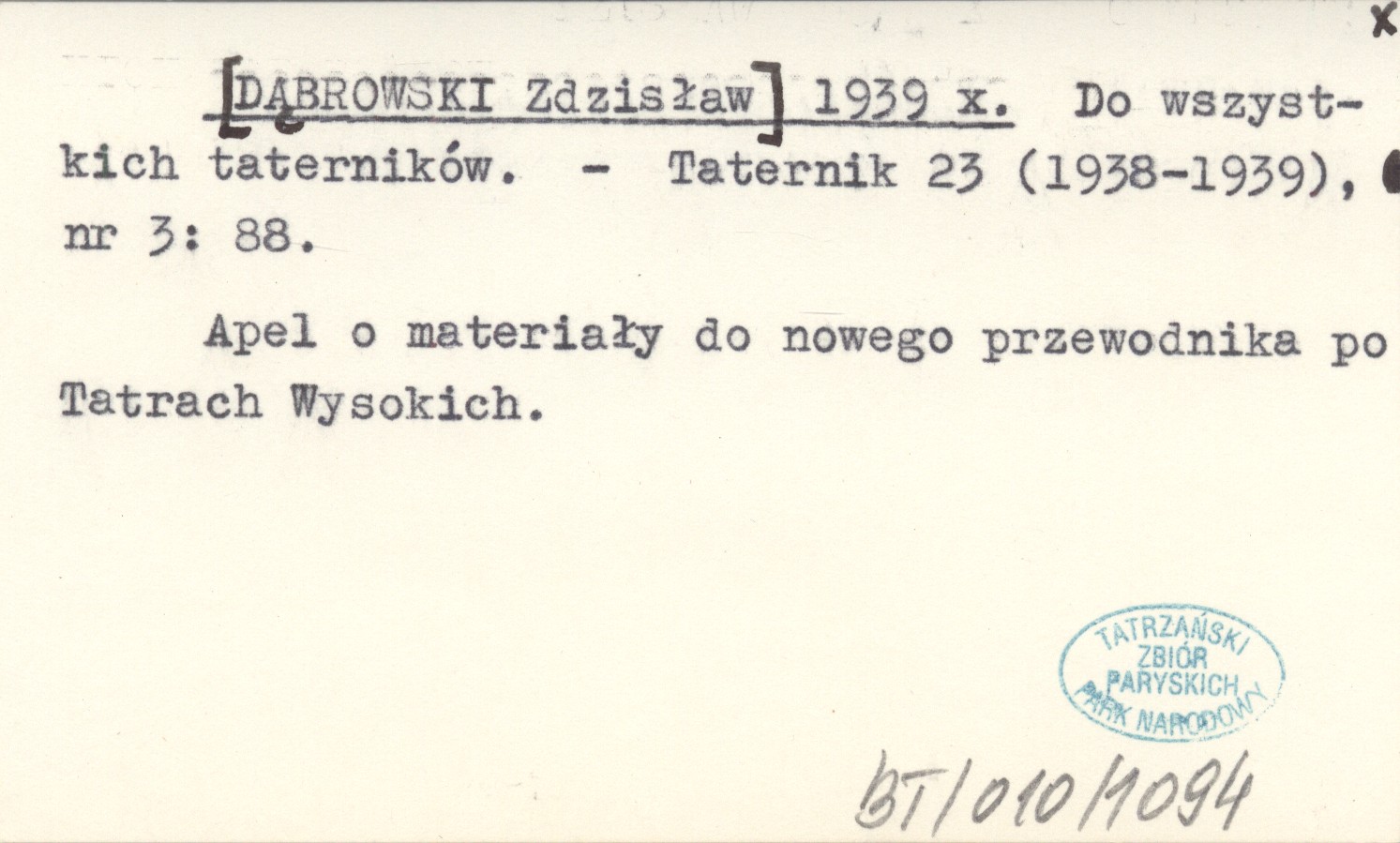 [DĄBROWSKI Zdzisław] 1939 x Do wszystkich taterników.