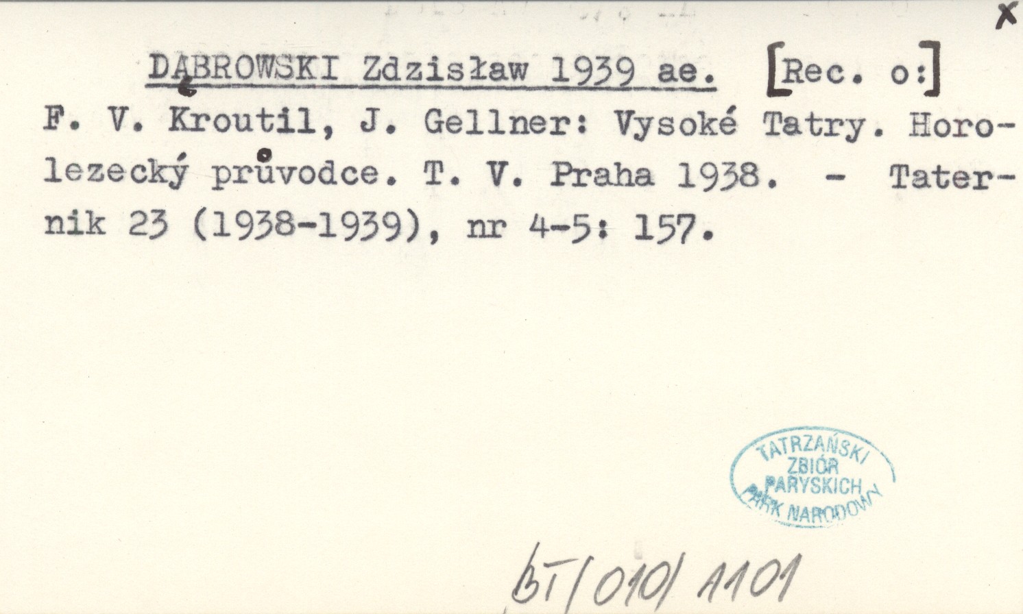 DĄBROWSKI Zdzisław 1939 ae [Rec. o:] F. V. Kroutil, j. Gellner: Vysoké Tatry. Horolezecký průvodce. T. V. Praha 1938.