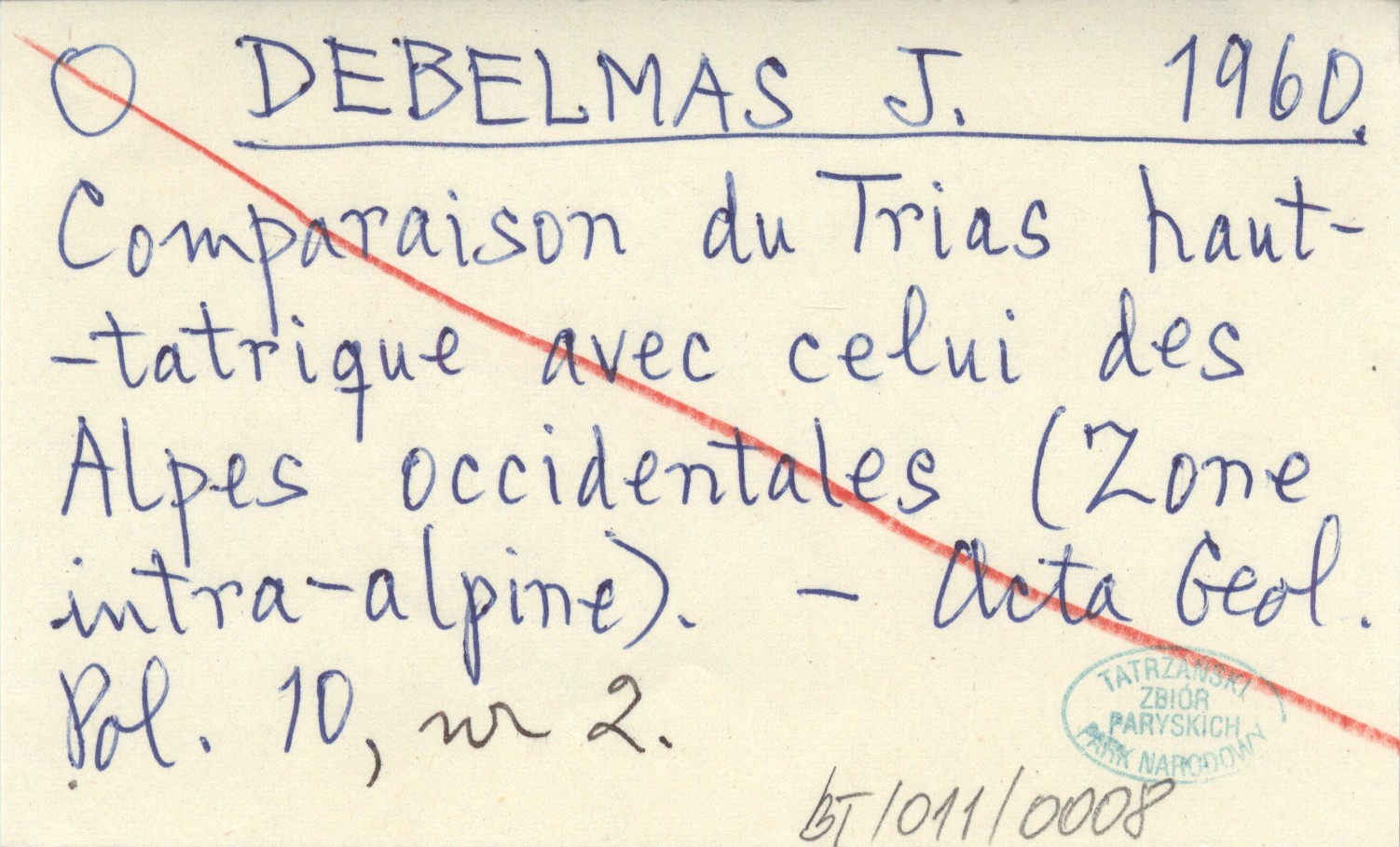 DEBELMAS J. 1960 Comparaison du Trias hauttatrique avec celui des Alpes occidentales (Zone intra-alpine).