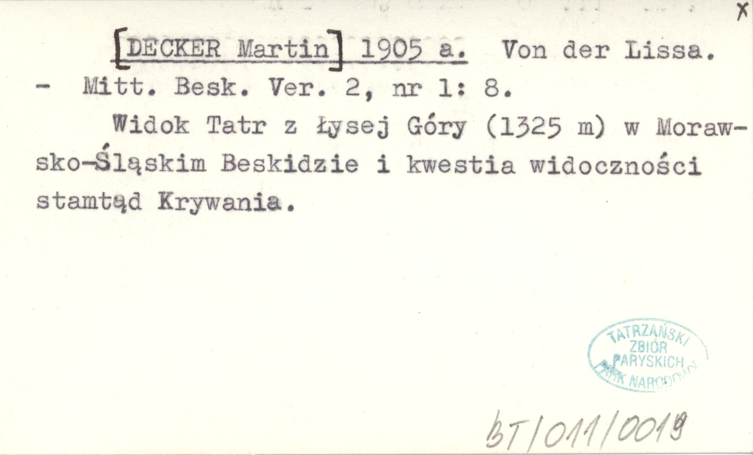 Mitt. Besk. Ver., 2, nr 1: 8. Widok Tatr z Łysej Góry (1325 m) w Morawsko-Śląskim Beskidzie i kwestia widoczności stamtąd Krywania.