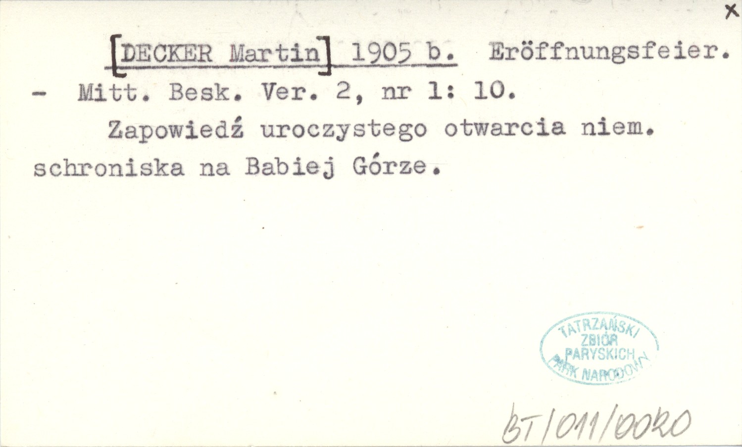 Mitt. Besk. Ver., 2, nr 1: 10. Zapowiedź uroczystego otwarcia niemieckiego schroniska na Babiej Górze.