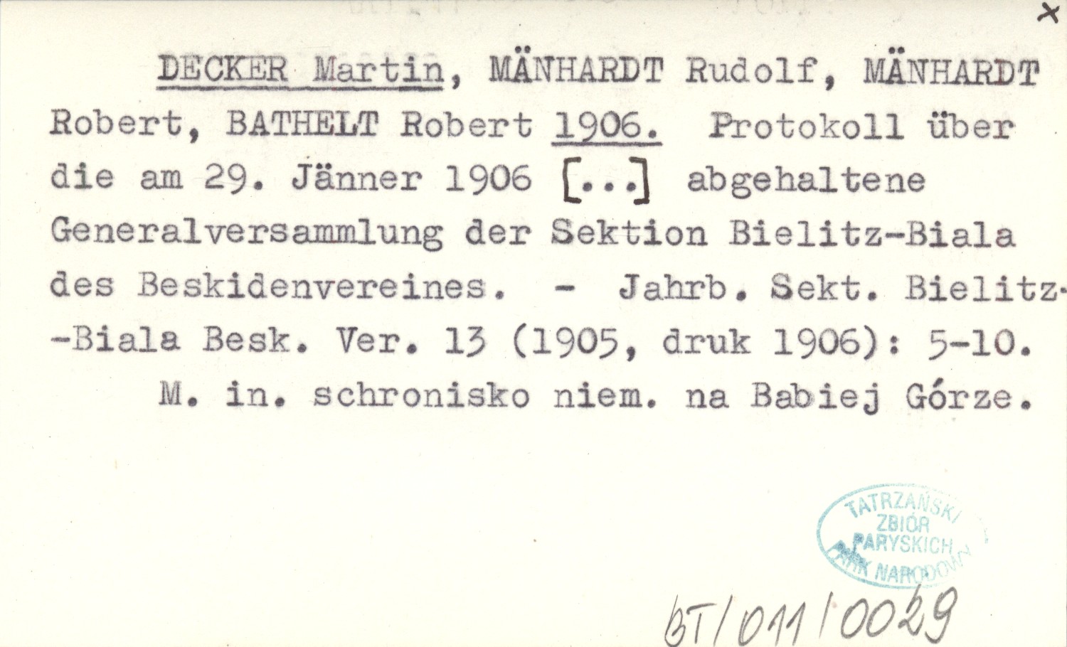 DECKER Martin MÄNHARDT, Rudolf. ; MÄNHARDT, Robert. ; BATHELT, Robert. ; 1906 Protokoll über die am 29. Jänner 1906 [...] abgehaltene Generalversammlung fer Sektion Bielitz-Biala des Beskidenvereines.