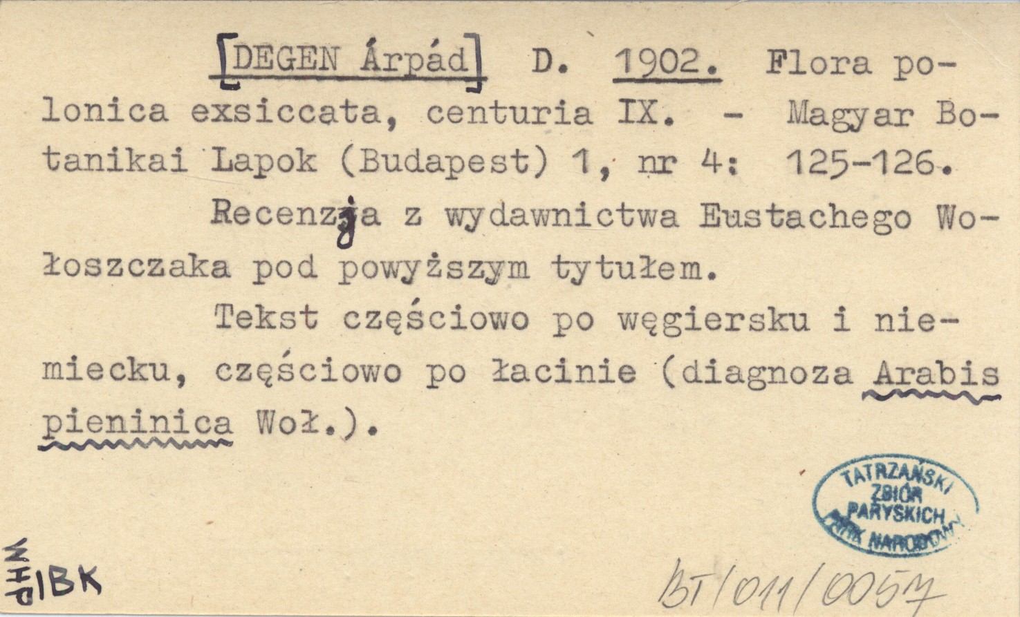 D. [DEGEN Árpád] 1902 Flora polonica exsiccata, centuria IX.