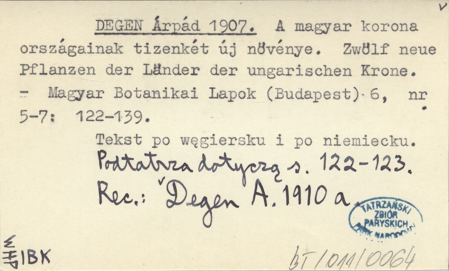Magyar Botanikai Lapok (Budapest) , 6, nr 5-7: 122-139. Tekst po węgiersku i po niemiecku. Podtatrza dotyczą S. 122-123. REC: Degen A. 1910 a