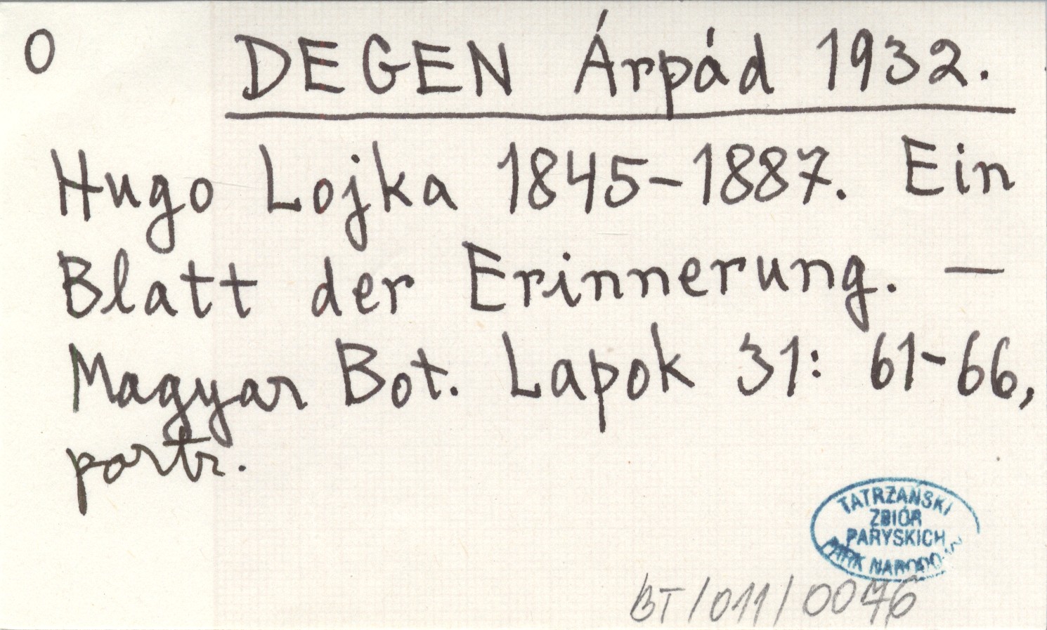 DEGEN Árpád 1932 Hugo Lojka 1845-1887. Ein Blatt der Erinnerung.