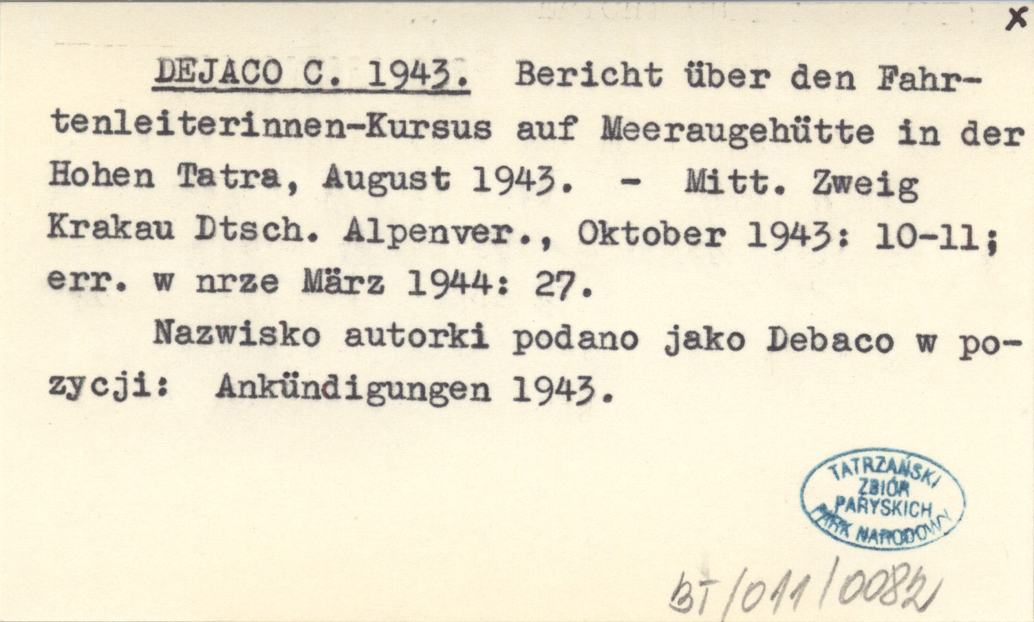 Mitt. Zweig Krakau Dtsch. Alpenver., 10.1943: 10-11, err. (03.1944): 27. Nazwisko autora podano jako Debaco w pozycji: Ankündigungen 1943.
