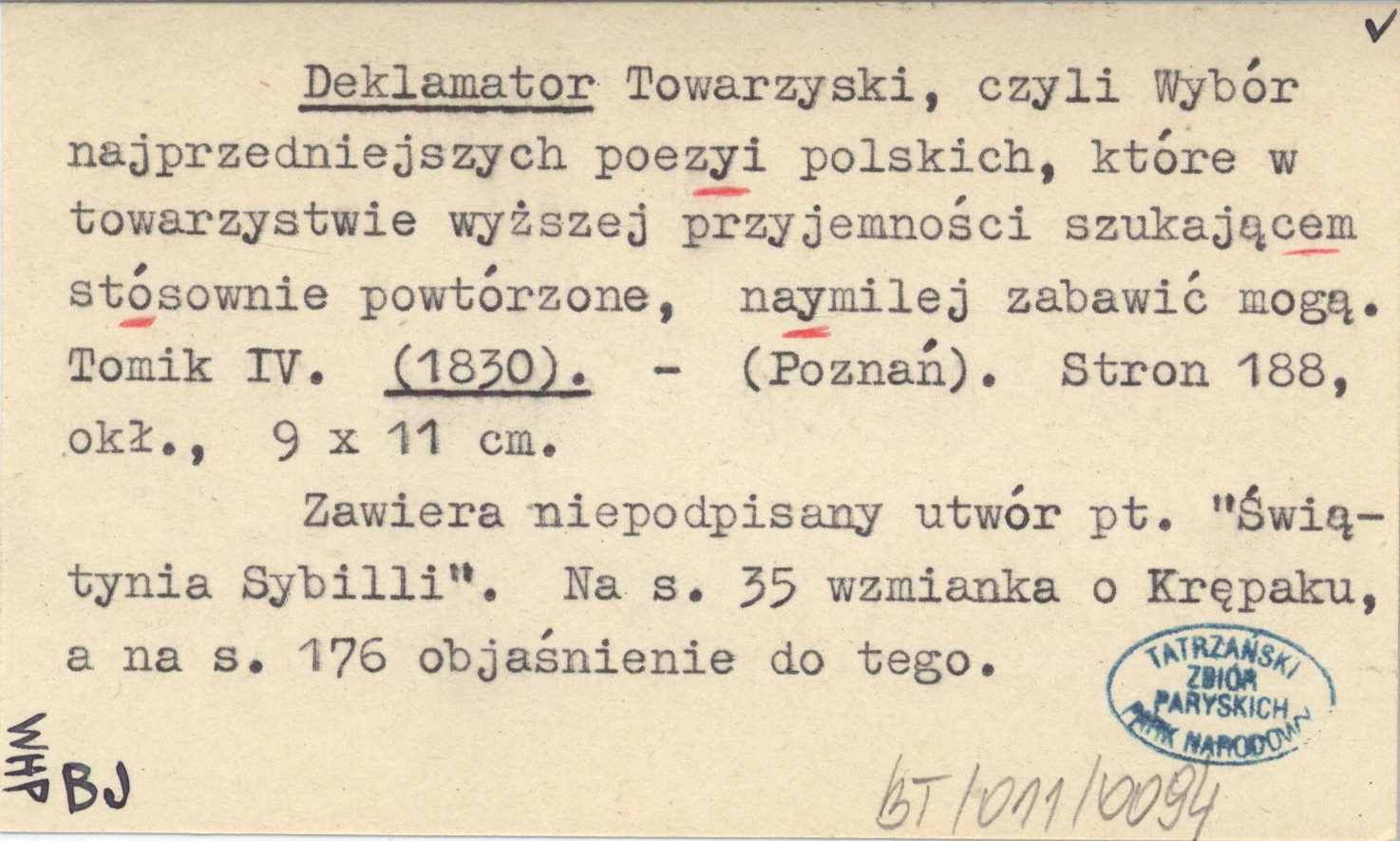 Poznań , 188 s., okł., 9x11 cm. Zawiera niepodpisany utwór pt. "Świątynia Sybilli". Na S. 35 wzmianka o Krępaku, a na S. 176 objaśnienie do tego.