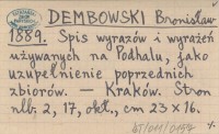 DEMBOWSKI Bronisław 1889 Spis wyrazów i wyrażeń używanych na Podhalu, jako uzupełnienie poprzednich zbiorów.