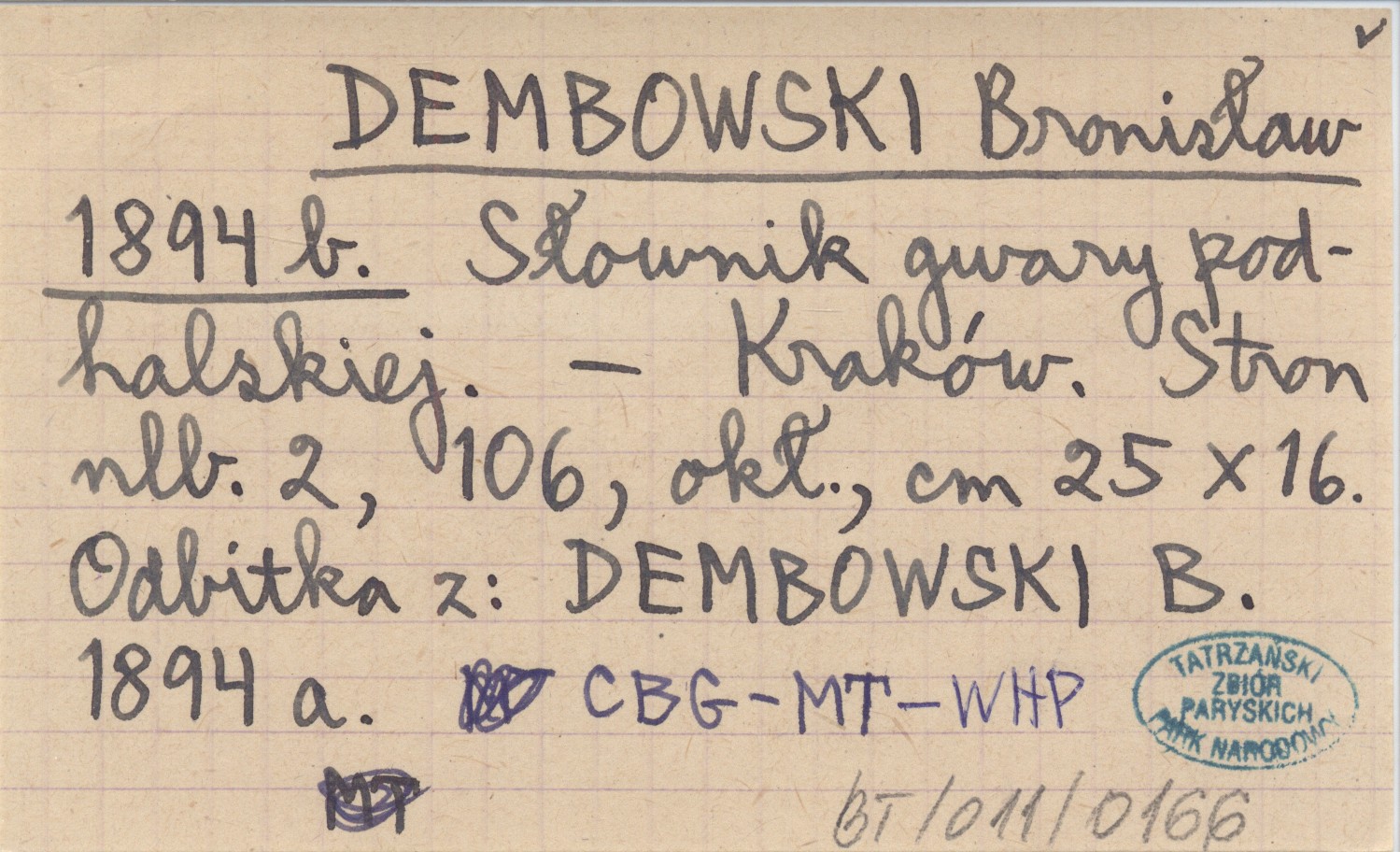 DEMBOWSKI Bronisław 1894 b Słownik gwary podhalskiej.