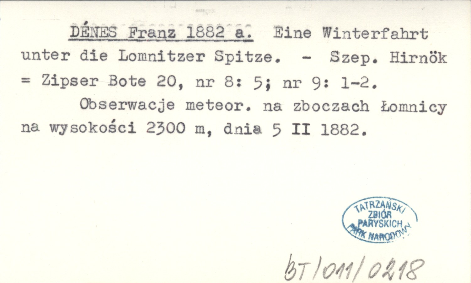 Szepesi Hirnök = Zipser Bote, 20, nr 8: 5; nr 9: 1-2. Obserwacja meteor. na zboczach Łomnicy na wysokości 2300 m, dnia 5 II 1882.