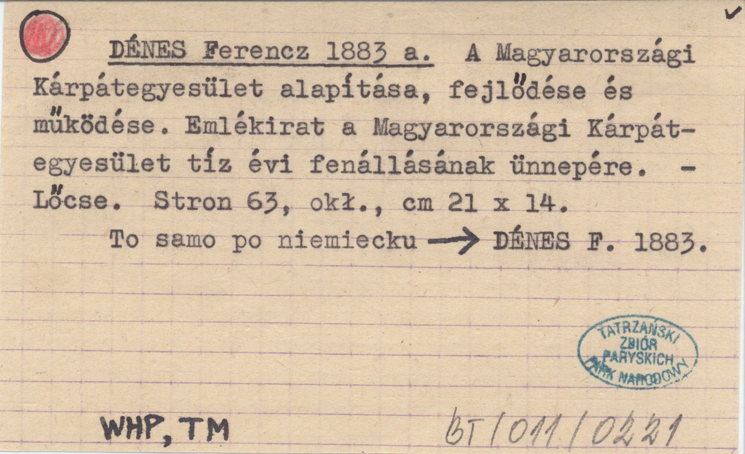 DÉNES Ferencz 1883 a A Magyarországi Kárpátegyesület alapítása, fejlődése és működése. Emlékitar a Magyarországi Kárpátegyesület tíz évi fenállásának ünnepére.