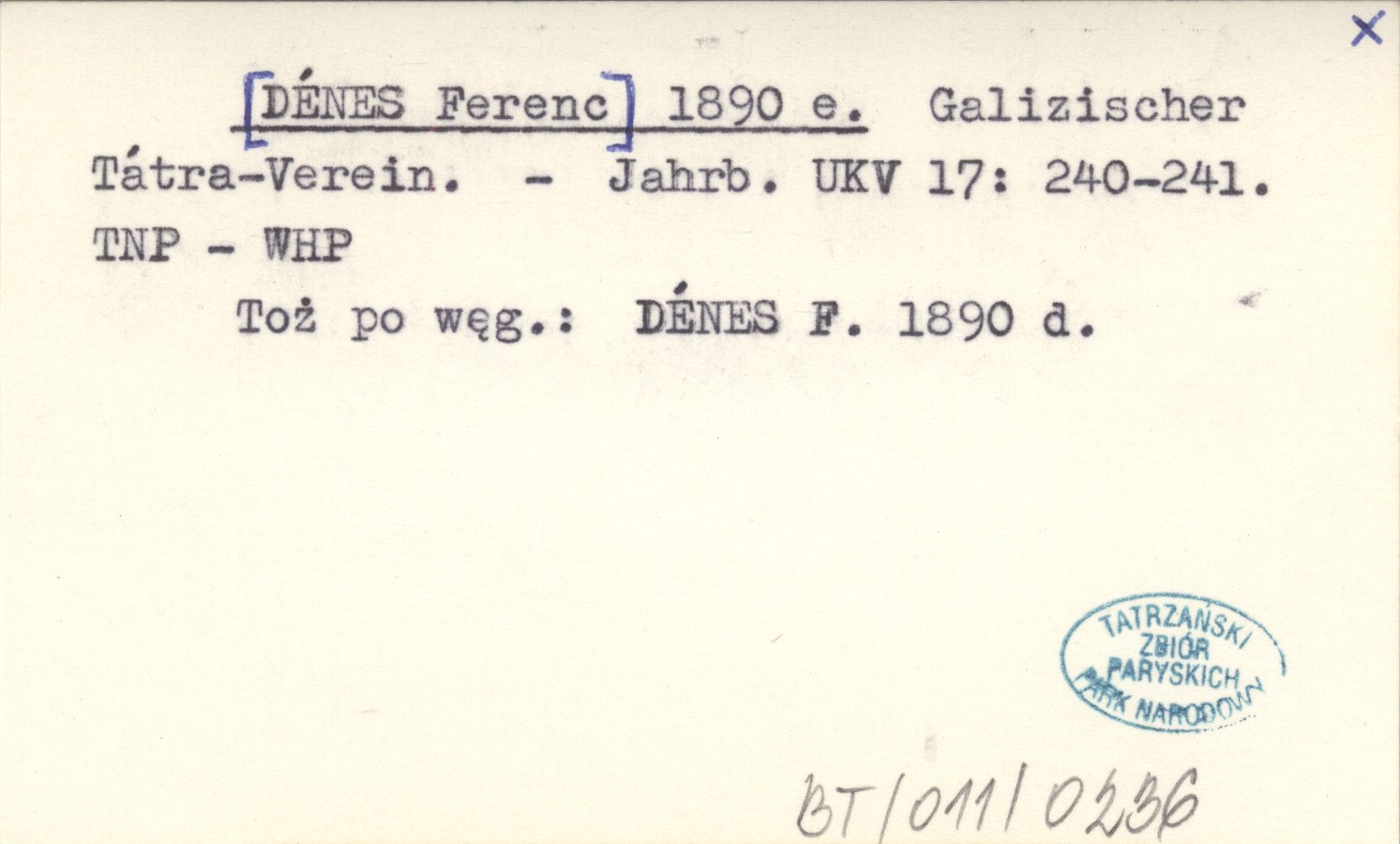 Jahrbuch des Ungarischen Karpathen-Vereines, 17: 240-241. Toż po węgiersku: DÉNES F. 1890 d.