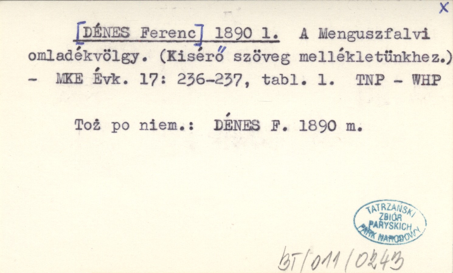 A Magyarországi Kárpát Egyesület Évkönyve, 17: 236-237, 1 k. Toż po niemiecku: DÉNES F. 1890 m.