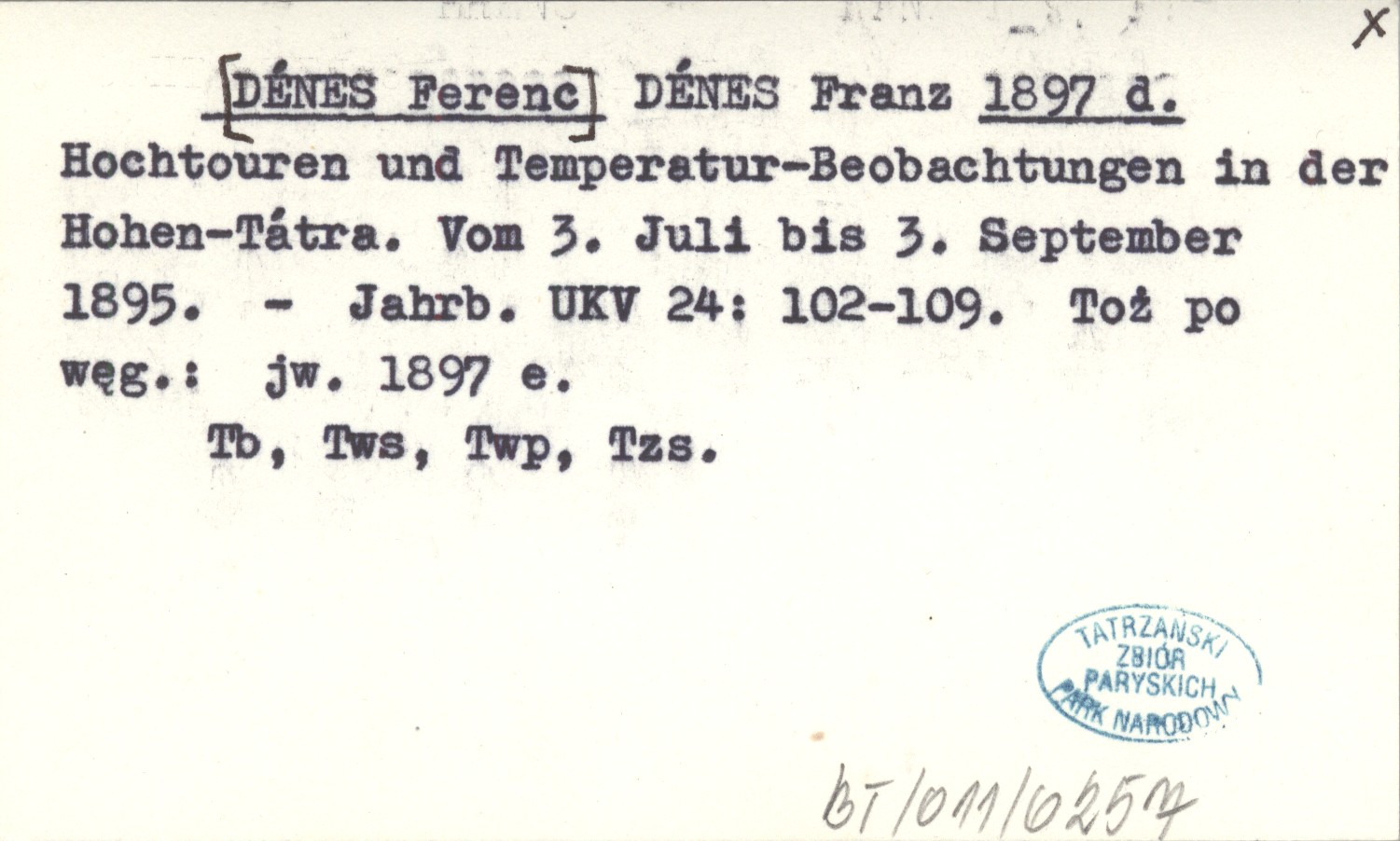 Jahrbuch des Ungarischen Karpathen-Vereines, 24: 102-109. Tb, Tws, Twp, Tzs. Toż po węgiersku: jw. 1897 e.