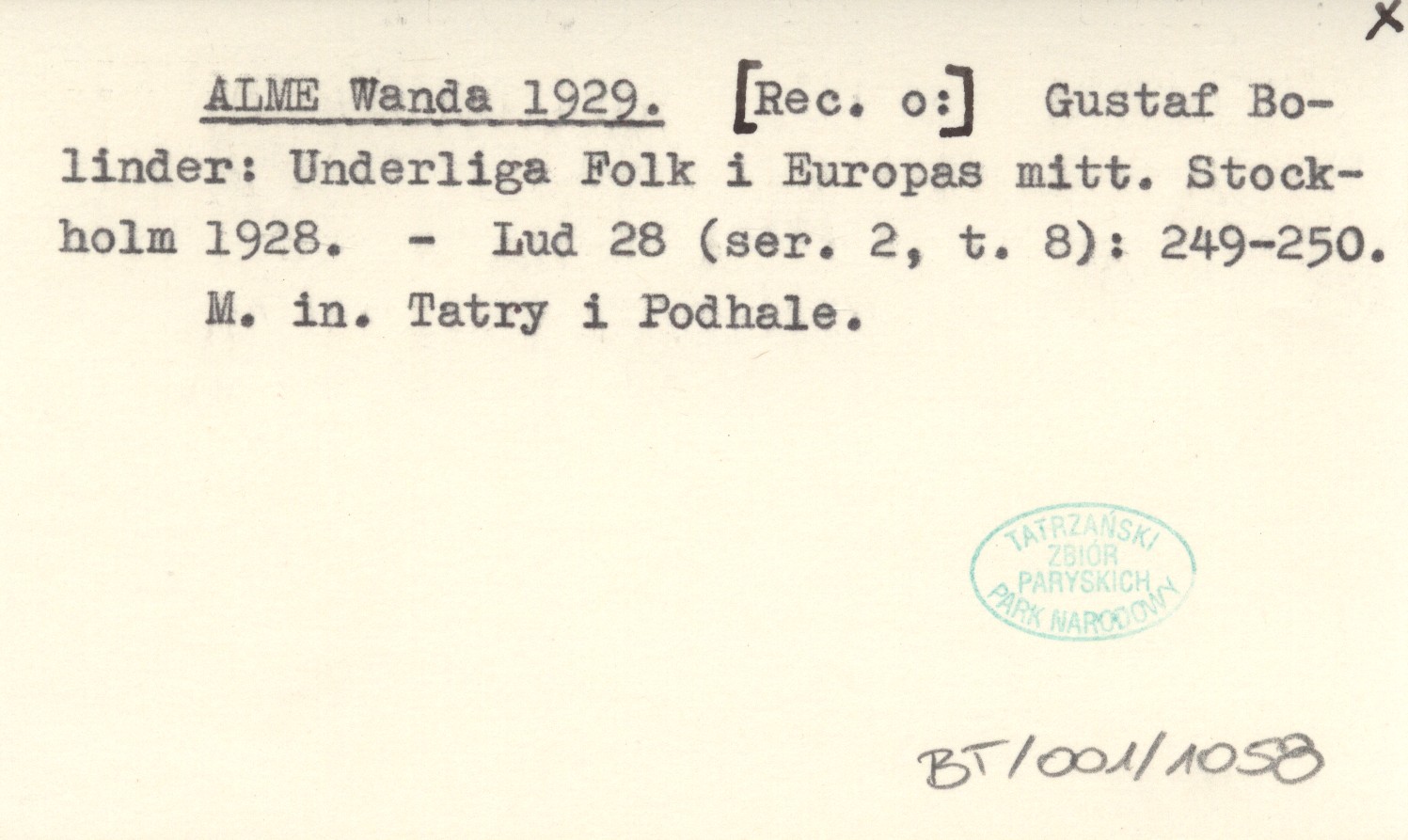 ALME Wanda 1929 Gustaf Bolinder: Underliga Folk i Europas mitt. Stockholm 1928.
